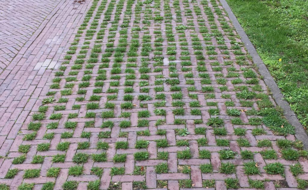 Een voorbeeld van een half open verharding met klinkers in vlechtverband